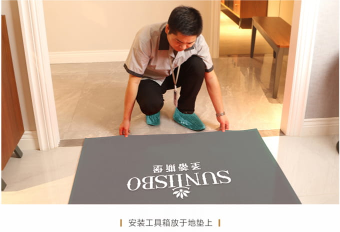 1、搬运之前现在客户家门前放置《PG娱乐安装施工指示牌》,搬运和安装过程中避免发生碰撞和声响,控制说话声音以免惊扰客户家人或碰坏物品。送货安装服务人员在进入顾客家前,应穿上自备的鞋套。