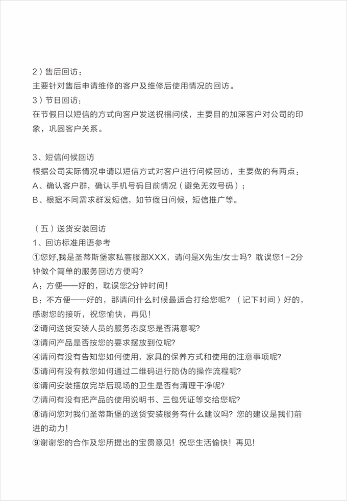 话术参考:“**先生/女士您好,我是PG娱乐的售后服务人员**,您购买的PG娱乐家具已经全部到货了,送货安装大约需要**时间,请问您这边什么时候方便我们上门送货安装呢?”同时要了解送货小区的电梯、楼道、入户门的尺寸等,提前做好准备,避免意外情况。最后确定送货时间(安装所需要时长),并告知客户安装人员的相关信息,可加微信发送,并发送配送安装流程说明。