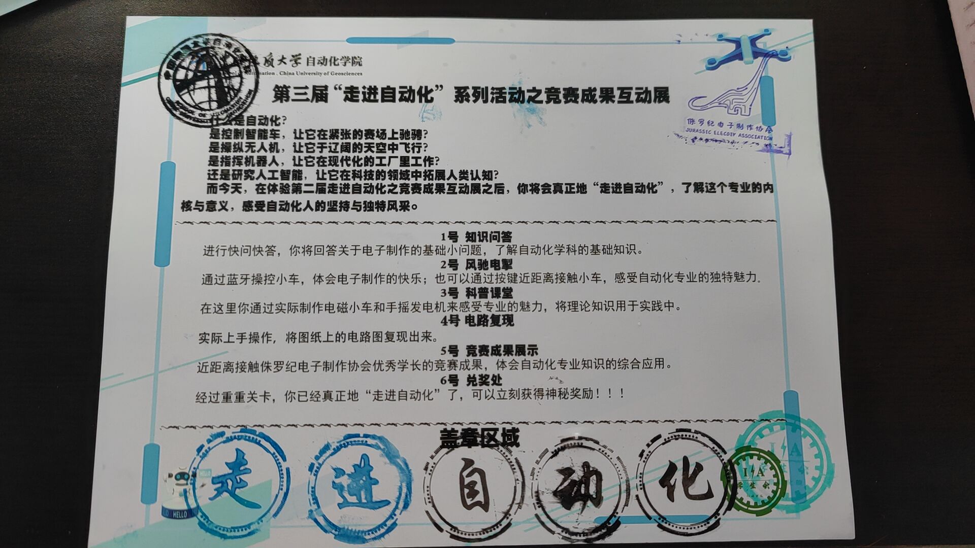 本次活动共设置了六个摊位(通过这六个摊位进行互动集章)。第一个摊位为知识问答环节,通过快问快答和元器件辨别环节,同学们了解了自动化学科的基础知识,对自动化学科产生了浓厚的兴趣;第二个摊位为风驰电掣,通过对于电机驱动小车的控制方式和平衡杆小车pid理论的了解,同学们感受到了自动化专业的独特魅力;