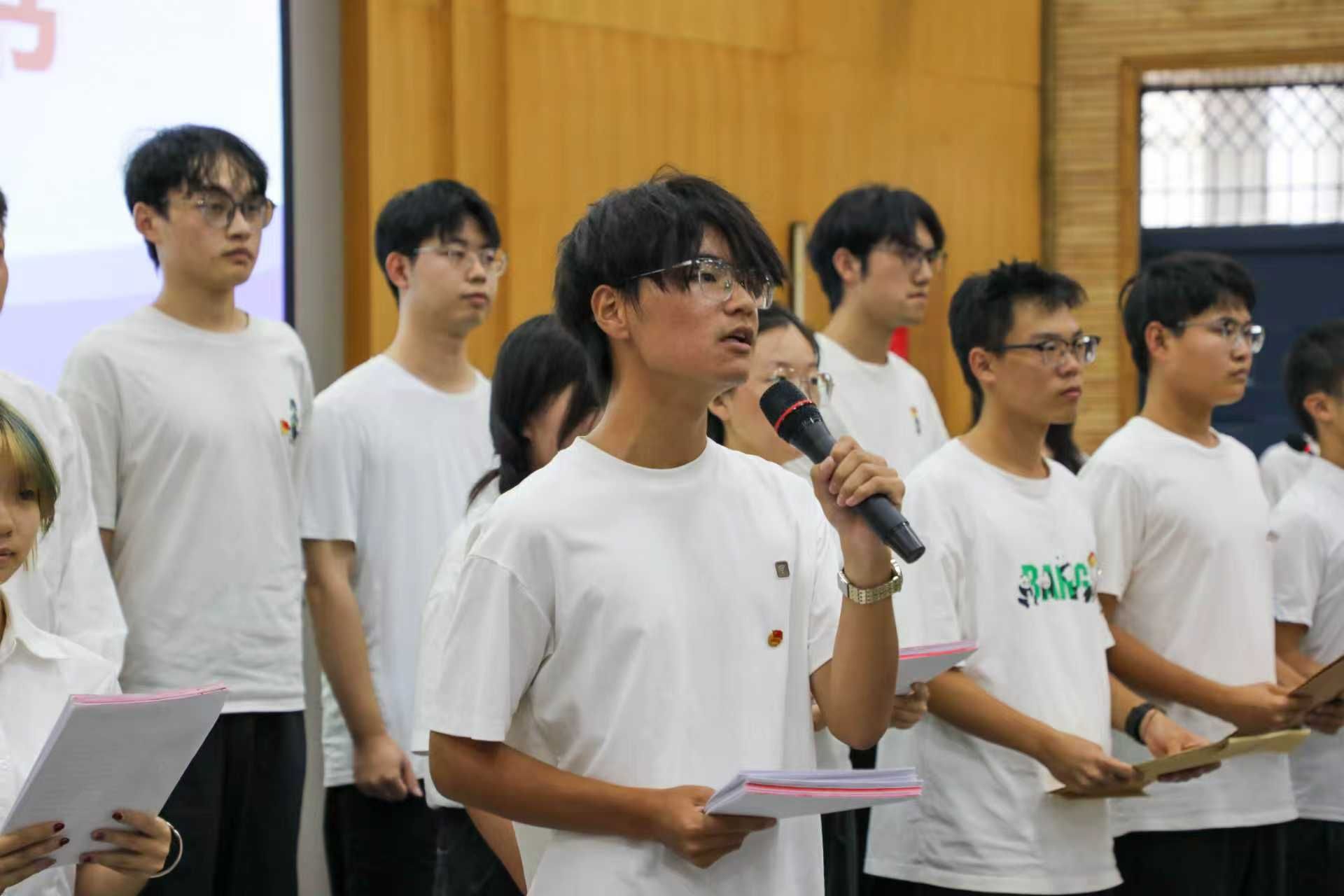“我们将积极向组织靠拢,努力成长为可堪大任的时代新人……”9名团员代表手握97份入党申请书,郑重地向党组织集中递交,这一份份沉甸甸的申请书,是青春向党的铿锵誓言,他们眼神坚定,姿态昂扬,用实际行动表达了坚定不移听党话、跟党走,为共产主义事业奋斗终身的坚定信念与决心。在团员代表陈光耀同学铿锵有力的话语中,理想与信仰交织,责任与使命共融,展现了新时代青年积极向党组织靠拢、矢志将青春奋斗融入党和人民事业的磅礴力量,将现场气氛推向高潮。