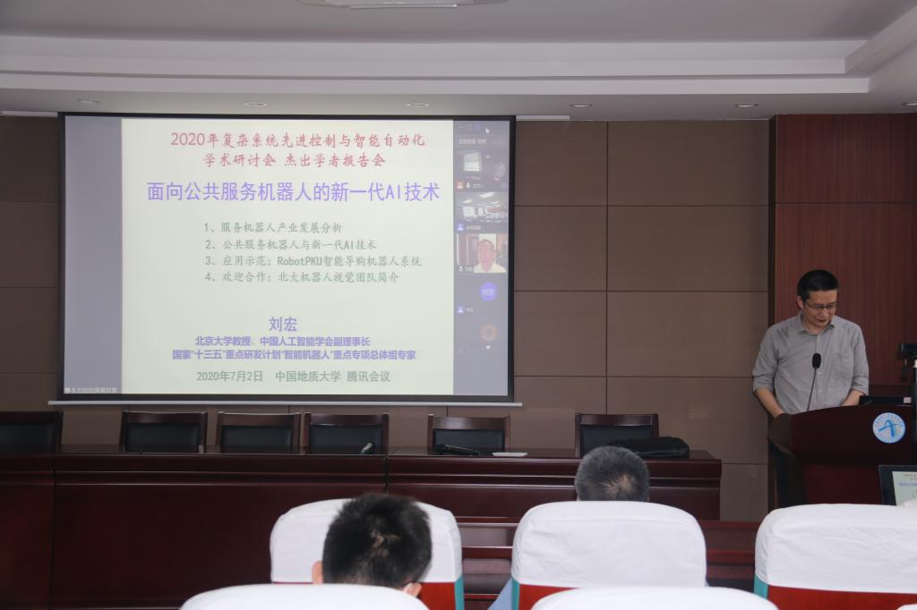 7月2日,“2020复杂系统先进控制与智能自动化学术研讨会——杰出学者报告会”随后举行。5位杰出学者受邀作了学术报告,湖北省科学技术厅吴骏处长、BB贝博艾弗森官网(武汉)科学技术发展院常务副院长胡圣虹出席报告会开幕式并讲话。北京大学刘宏教授做了题为《面向公共服务机器人的新一代AI技术》的学术报告,华中科技大学高亮教授做了题为《设计自动化的变革前夜》的学术报告,大连理工大学赵珺教授做了题为《工业能源系统预测与优化调度》的学术报告,BB贝博艾弗森官网(武汉)陈鑫教授做了题为《复杂环境带电作业机器人关键技术与应用》的学术报告,中国科学技术大学李智军教授做了题为《可穿戴机器人关键技术及其应用》的学术报告。