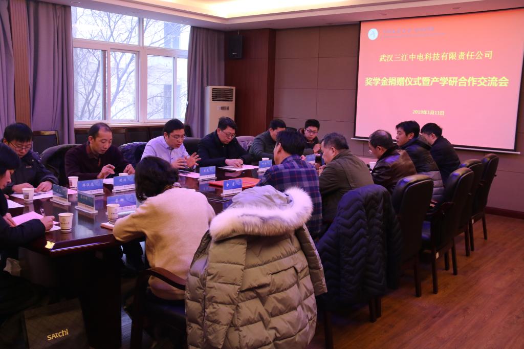 1月11日,武汉三江中电科技有限责任公司奖学金捐赠仪式暨产学研合作交流会在贝博官网会议室举行。武汉三江中电科技有限责任公司董事长黄凯、总经理叶鹏一行9人,贝博官网校友工作与教育基金管理处副处长吕占峰,贝博官网院长吴敏、党委书记董浩斌、副院长金星、曹卫华等院领导和相关教师出席了捐赠仪式。副院长金星主持仪式。