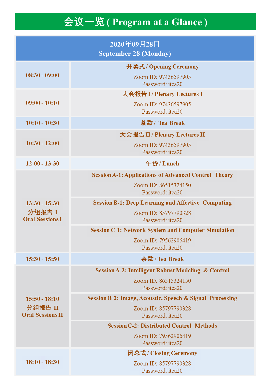 第13届中日信息技术与控制应用国际研讨会(ITCA2020)由BB贝博艾弗森官网(武汉)、湖北民族大学承办,将于2020年9月28日以Zoom线上会议形式举行。会议日程及Zoom ID等信息如下: