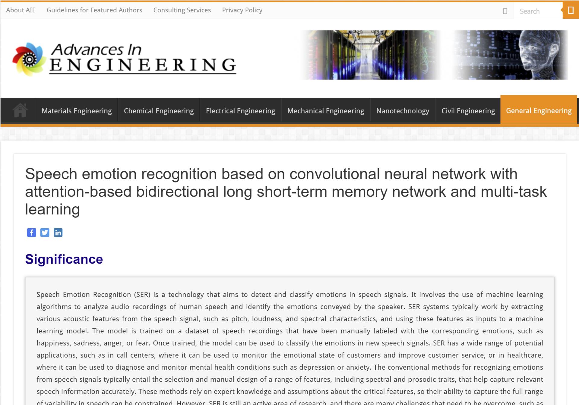 近日,国际工程领域机构Advances in Engineering (AIE) 对贝博官网情感计算团队的最新研究成果——“Speech Emotion Recognition Based on Convolutional Neural Network with Attention-based Bidirectional Long Short-term Memory Network and Multi-task Learning”进行专题报道。AIE所报道的论文是由国际专家顾问组选出,方向包括通用工程、电子、机械、土木、纳米、材料、生物医学工程等,中选率为以上领域发表论文总数的1‰AIE拥有广泛的读者群,每月的阅读量超过75万次