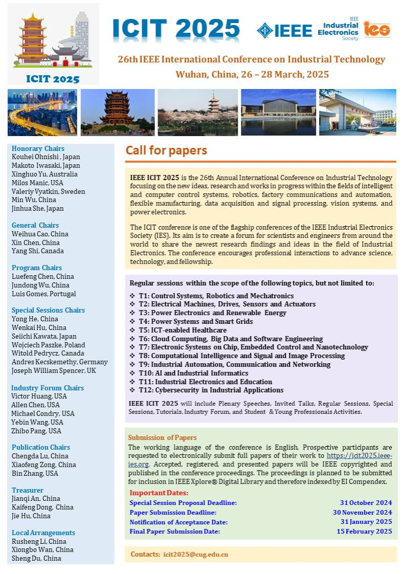 第26届IEEE国际工业技术大会(ICIT2025)将于2025年3月26日至28日在中国武汉举办,由BB贝博艾弗森官网(武汉)自动化学院承办。ICIT2025重点关注智能和计算机控制系统、机器人技术、工厂通信和自动化、柔性制造、数据采集和信号处理、视觉系统和电力电子等领域的新思想、新研究和新进展。