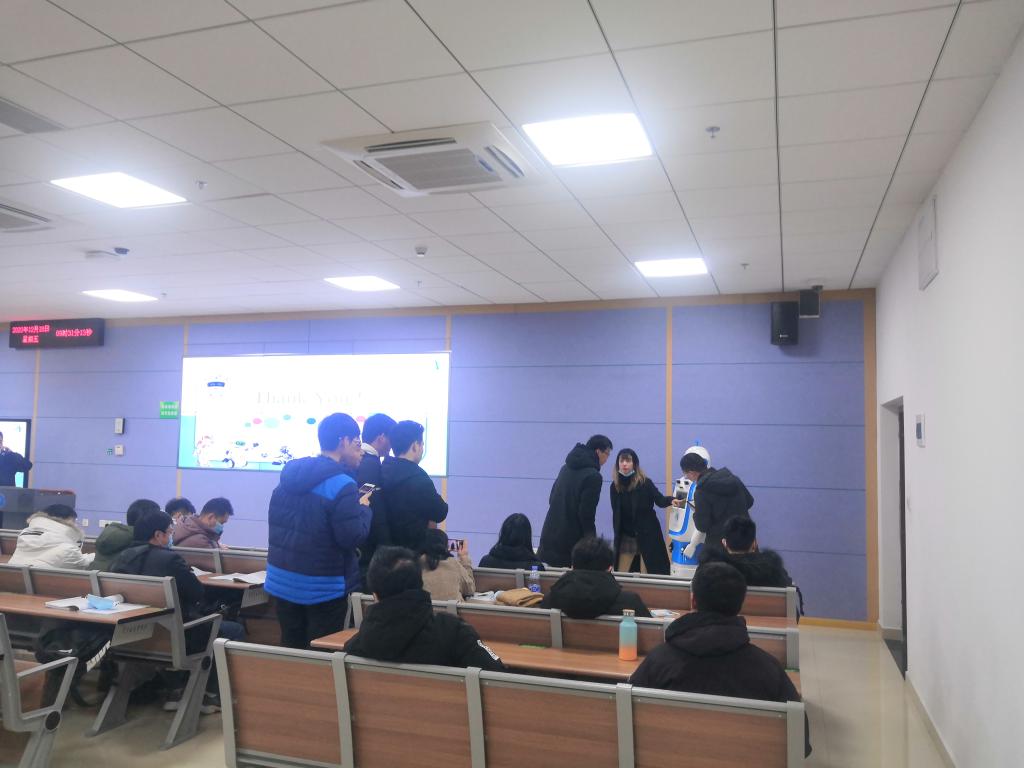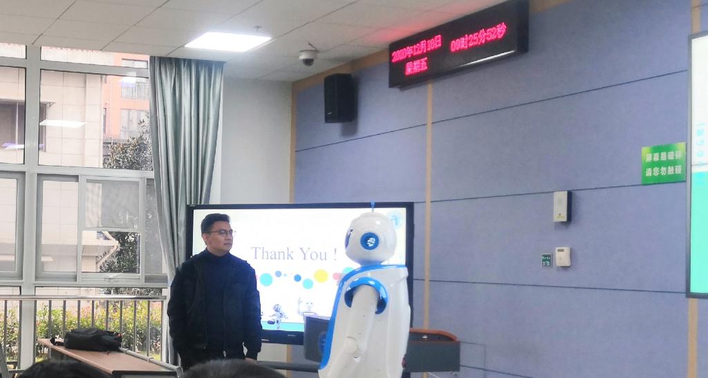 同学们在听完对于情感机器人WEBO的介绍后,纷纷踊跃上台,与情感机器人WEBO进行一场“面对面”的交流。在下课钟声敲响时,大家才依依不舍的结束与情感机器人WEBO的互动。最后,全体师生与情感机器人WEBO进行拍照留念。