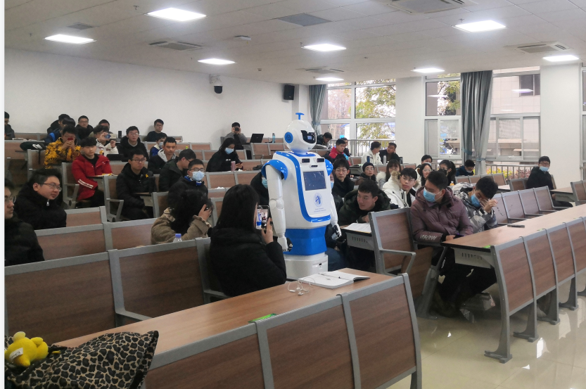 2020年12月18日,在《智能机器人技术》的本科生课堂上,贝博官网情感计算团队研发的情感机器人WEBO(We Robot)首次公开亮相。WEBO一进入教室,就吸引了在场学生的全部注意力。WEBO外观主要由带有地大特色的蓝白色组成,头顶设计了地大标志——地质锤,并且身上还绘制极具标志性的BB贝博艾弗森官网(武汉)校徽与自动化学院院徽。