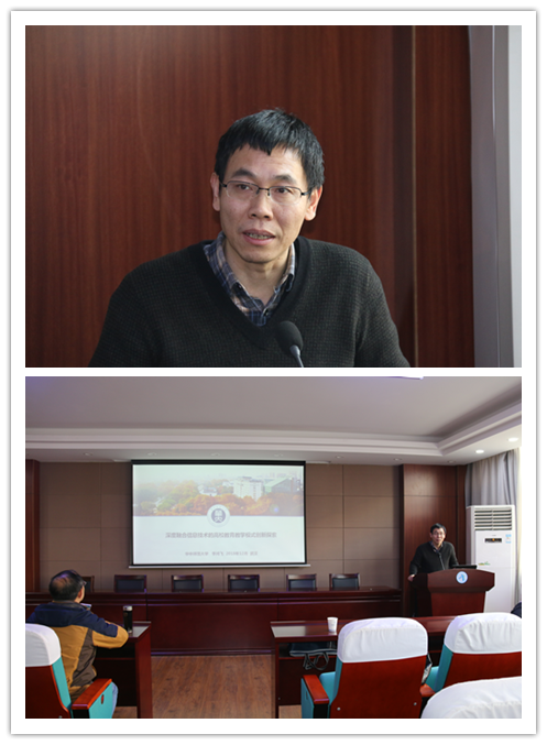 12月12日下午,华中师范大学李鸿飞教授应邀来贝博官网作了题为《深度融合信息技术的高校教育教学模式创新实践》的教学研究报告。作为2018年教育部高等教育国家级教学成果特等奖得主,他介绍了以学生为中心的连接教育,构建信息时代的教育支撑体系;实现“以教为主”到“以学为主”,“以专业教育为主”到“以通识教育和专业教育为主”,“以课堂为主”到“课内外结合”,“以结果评价为主”到“结果和过程评价结合”的四个转变;构建“云+端”一体化教学模式;搭建“物理·资源·社交”三空间深度融合的智能型教学环境。这一报告让人耳目一新,为贝博官网人才培养的信息化建设提供了宝贵经验和动力。