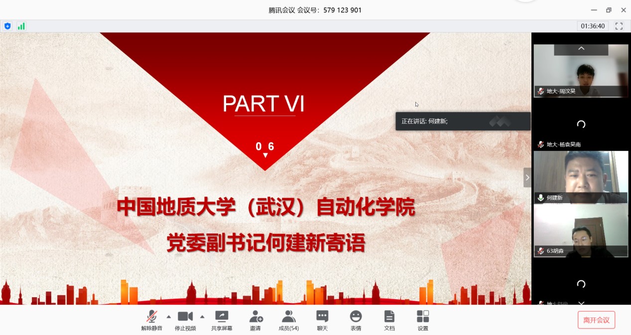 (通讯员:黄兰华 周汶昊)为学习贯彻习近平总书记关于疫情防控工作的系列重要讲话和指示批示精神,认真贯彻落实习近平总书记给北京大学援鄂医疗队全体“90后”党员的回信精神,5月2日晚19:30,BB贝博艾弗森官网(武汉)自动化类专业23Z192班与中国石油大学(华东)地质类1901班“云”端相聚,联合开展以“绽放战疫青春,坚定制度自信”为主题的线上团会。本次团会出席的嘉宾有BB贝博艾弗森官网(武汉)自动化学院党委副书记何建新,团委副书记许彦,2019级辅导员黄兰华,中国石油大学(华东)地球科学与技术学院党委副书记徐永涛,团委书记霍宁宁,团委副书记姜永昶,地质类1901班主任袁静教授,山东大学齐鲁医院内分泌科护士长郑会珍。本次主题团会坚定青年学生制度自信,激励学生练就过硬本领,投身强国伟业,始终保持艰苦奋斗的前进姿态,在实现中华民族伟大复兴中国梦的新长征路上奋勇搏击。