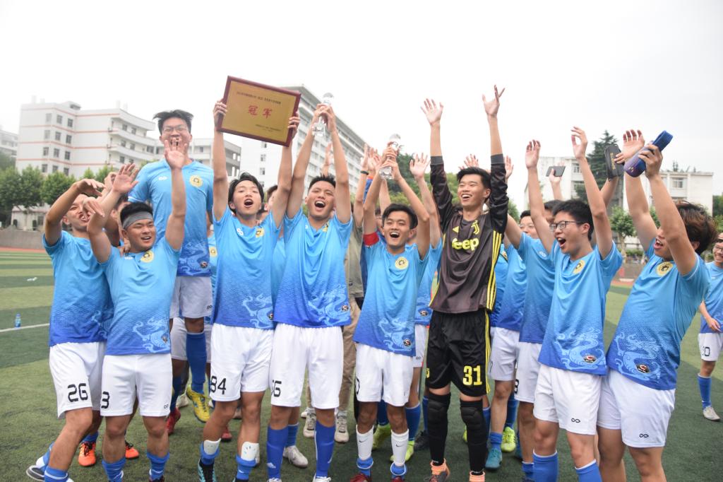 炽热的太阳,激起了球员们的热情;挥洒的汗水,映出了球员们的激昂;强劲的对手,燃起了球员们的斗志!4点10分战鼓声响起,两边队员迅速投入比赛,场边呐喊声、激昂的鼓声、尖叫声此起彼伏,让比赛的气氛达到了高潮。上半场比赛状况胶着,两队之间你来我往,都未进球。下半场比赛,迅速进入白热化阶段,比赛场上战火燃烧,场下观众情绪激昂,奋力呐喊,鼓声震天,呐喊声夹杂着鼓声充斥着整个赛场。第54分钟,7号易傲松助攻11号何志伟打进一球,第80分钟,队长张健荣又一脚射穿了体院的球门,比分拉到了2:0!不论是球员还是观众,都在为两颗精彩绝伦的进球欢呼。这两粒进球确定了自动化学院夺冠的局势。下午6点,随着裁判终场哨声响起,自动化学院以2:0战胜劲敌体育学院,获得了本届地大杯足球赛冠军!这是历史性的一刻,自动化学院足球队首次冲进决赛!首次夺冠!