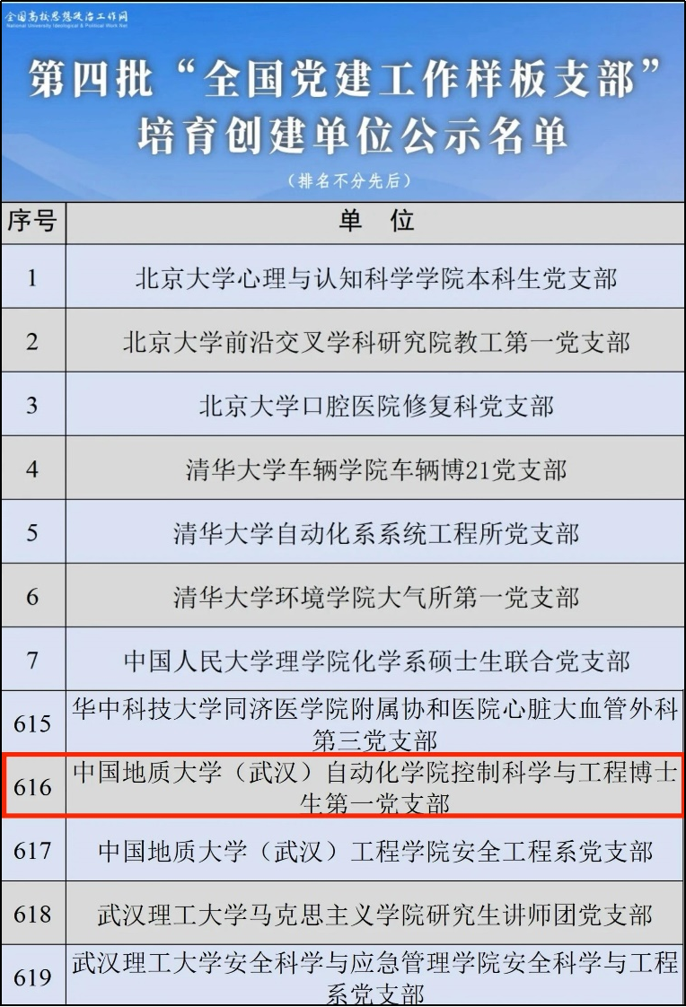 近日,教育部公布了第四批新时代高校党建示范创建和质量创优培育创建单位名单,其中,自动化学院控制科学与工程博士生第一党支部作为学校首个研究生党支部创建单位,入选“全国党建工作样板支部”,也是支部继2022年入选首批湖北省高校党建工作样板支部培育创建之后,党建工作取得的新成绩。