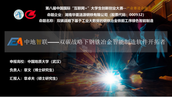 “中地智联——双碳战略下钢铁冶金智能制造软件开拓者”团队主要由贝博官网博士研究生章文、章卓夫、王炎、梁静杰等十余名硕博研究生组成,陈略峰、胡杰、杜胜、王向东、王艺霖等老师共同指导。该参赛团队的命题发榜单位为——湖南华菱涟源钢铁有限公司(股票代码:000932),在成功揭榜后,团队基于命题要求,依托自身多年在钢铁冶金领域的前沿技术积累,深入企业交流,定制化改进了钢铁全流程集中监控软件、淬火过程板形控制软件和干熄焦过程控制软件,自主设计了一套基于工业大数据的钢铁冶金全流程智能管控系统,使钢企的工作效率大幅度提升,实现生产过程中的节能减排,达到降本增效的经济效益,助推钢铁企业的绿色智能制造转型。