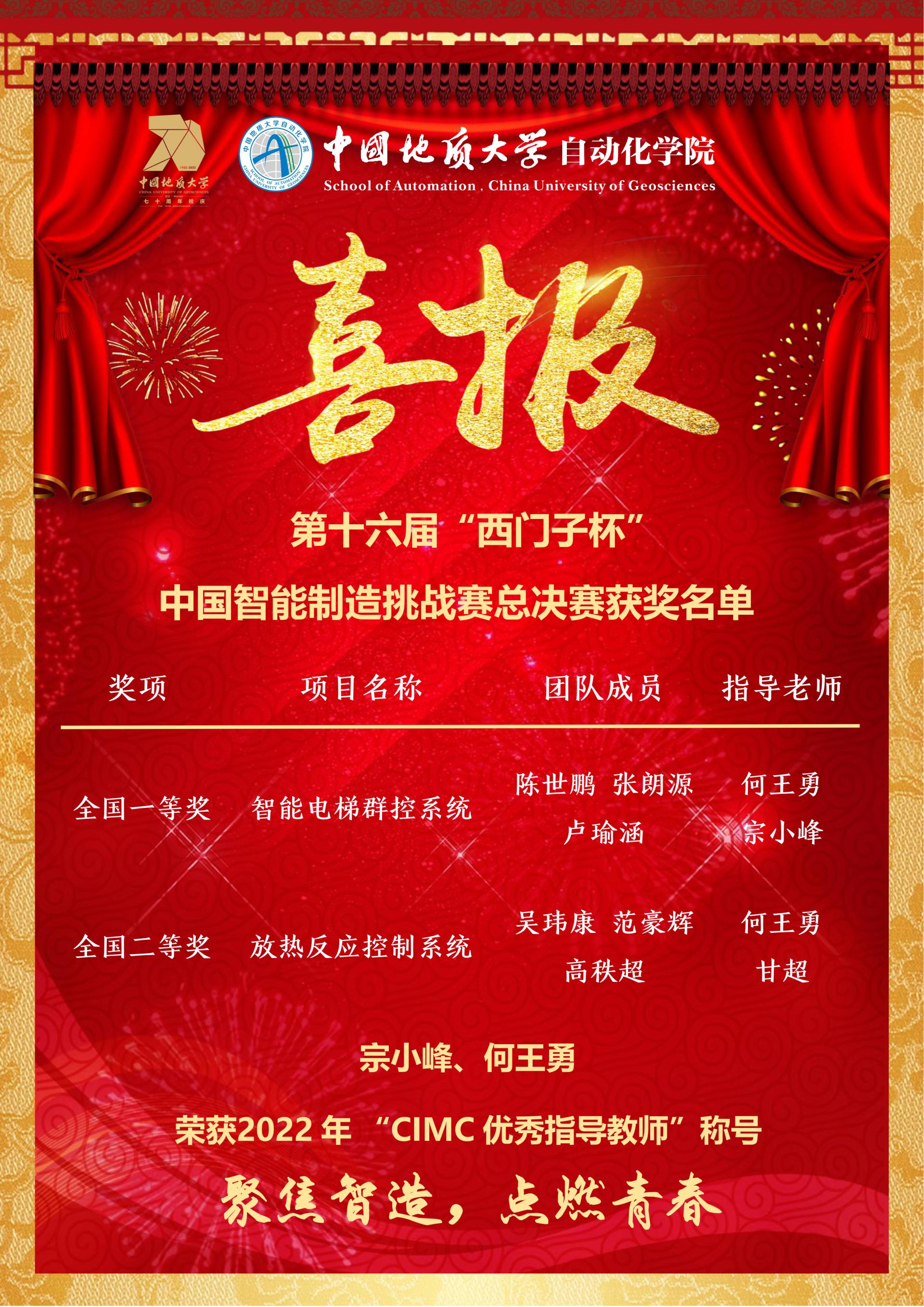 今年3月开赛以来,贝博官网高度重视,积极组织动员,挖掘培育本科生团队,共11支团队报名参赛,学院为每支团队配备两名指导老师,经过多轮培训指导,7月在华中赛区的初赛中共斩获特等奖一项与一等奖三项。但由于比赛规则限制,最终确定两个项目组第一名队伍代表学校参加全国总决赛,并在国赛的舞台上荣获全国一等奖一项、全国二等奖一项。宗小峰、何王勇老师荣获“CIMC优秀指导老师”称号,实现了贝博官网在“西门子杯”全国总决赛的新跨越。