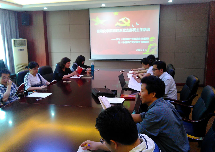 201655日下午,自动化系党支部在信息楼316会议室召开了支部主题党日组织生活会,集中学习了学校两学一做”教育实施方案、《中国共产党廉洁自律准则》和《中国共产党纪律处分条例》。