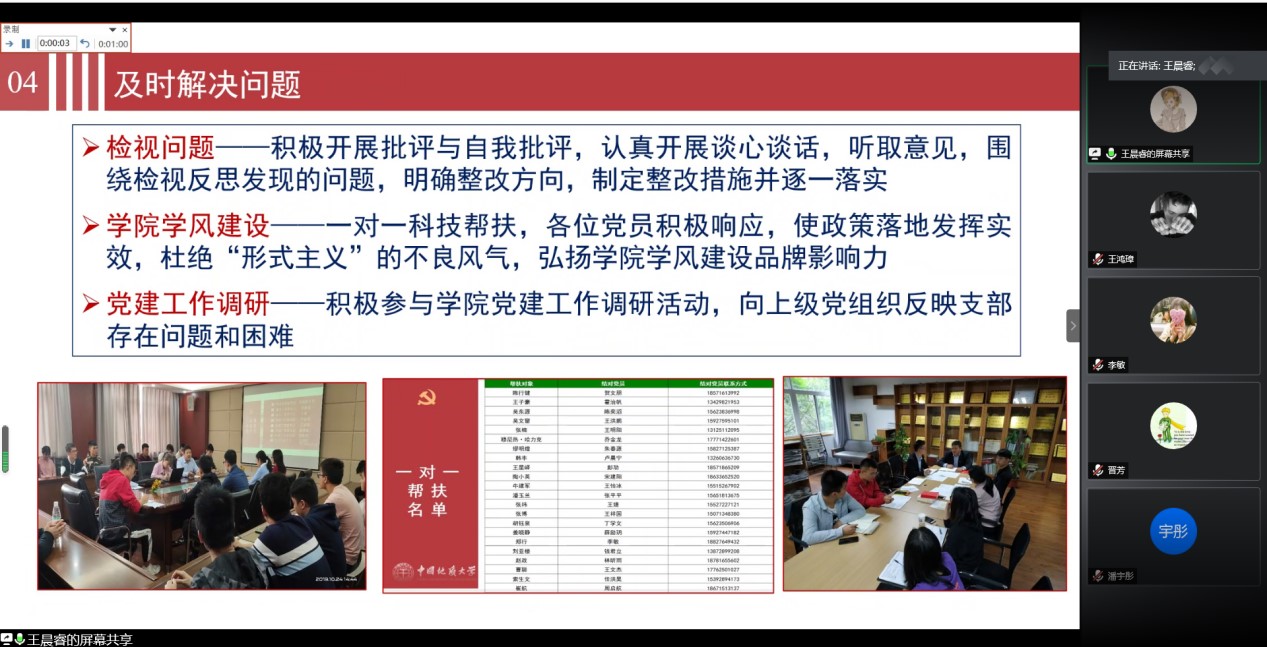 本次共有9个学生党支部参加样板支部的申报答辩,各支部书记围绕建设基础、建设计划、预期成果三方面进行汇报。本科生党支部介绍了支部开展的三次专题学习、主题教育知识竞赛、“一对一”结对帮扶、支部书记讲党课、对照党章党规找差距、科技帮扶及其它特色活动,将思想引领和价值观塑造贯穿于专业课程学习、社会实践活动、创新创业教育、志愿服务。