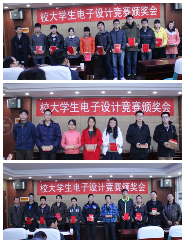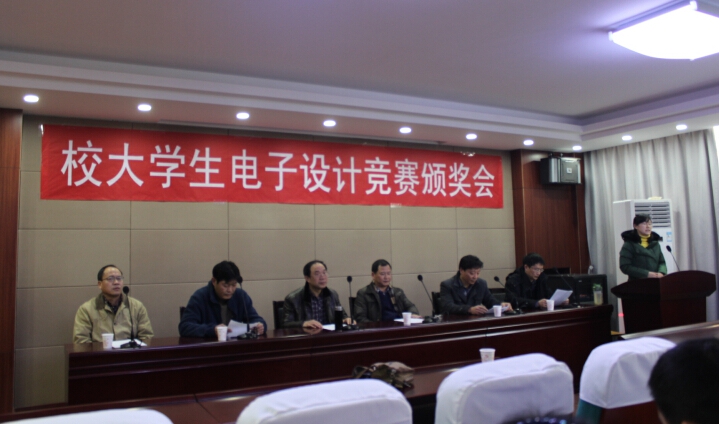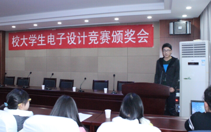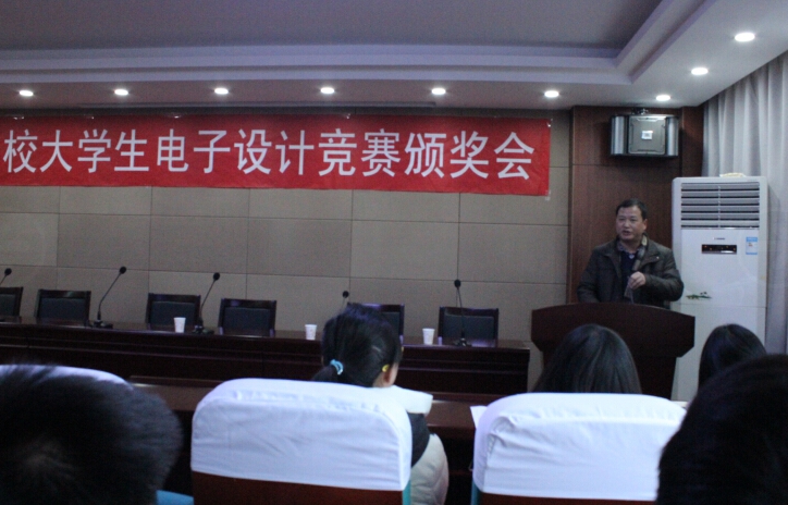 2014年12月29日下午,由校教务处和信息技术教学实验中心共同举办的2014年校大学生电子设计竞赛颁奖会在信息楼310学术报告厅隆重举行。出席本次颁奖会的嘉宾有资产与实验室设备处处长徐四平、自动化学院书记董浩斌、教务处副处长吕占峰、信息技术教学实验中心主任兼自动化学院副院长金星、自动化学院副院长曹卫华、自动化学院副院长王广君、机电学院副院长罗杰等领导。