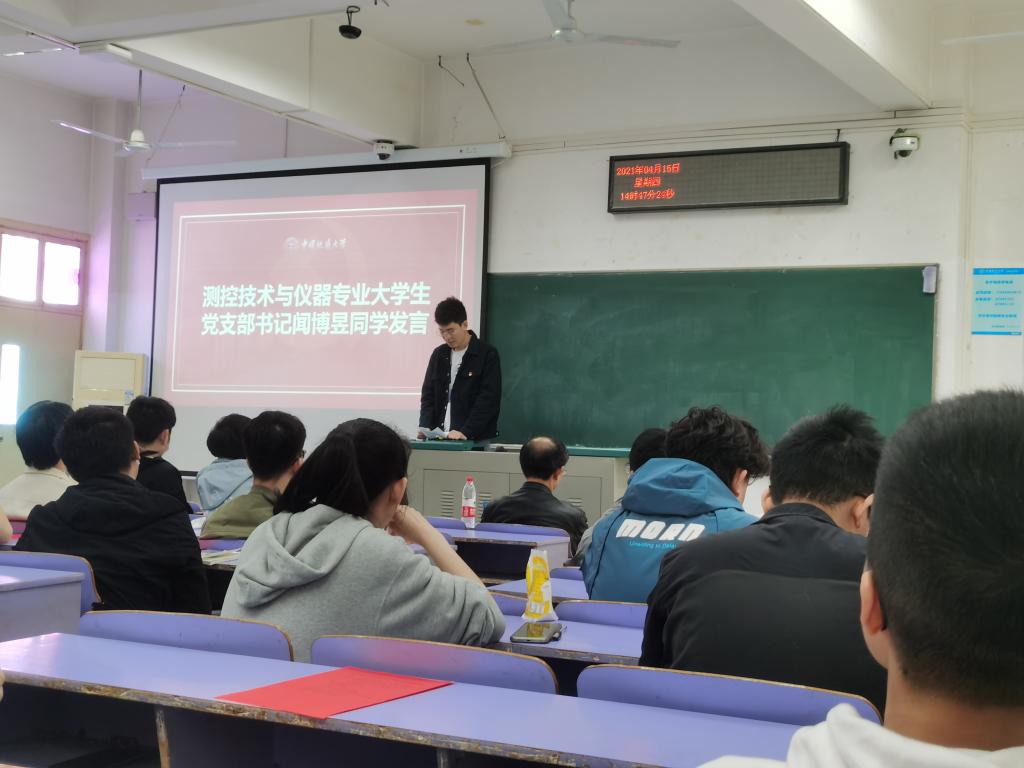 接下来,测控技术与仪器大学生党支部书记闻博昱同学和学院团委兼职副书记刘志杰同学作为学生代表发言。闻博昱同学谈到,在党史学习过程中应坚持“联系学习实际、联系工作实际、联系方法实际”,党支部将以建党100周年为契机制定详细的工作计划,开展主题党日、参观纪念馆、观看红色电影、唱红歌等活动,充分调动支部成员学习党史的激情和热情。刘志杰同学围绕庆祝建党100周年和党史学习教育阐述团委学生会工作思路。一是加强学习,坚定理想信念。二是积极思考,丰富活动内涵。三是依托实践,内化理论成果。他谈到,我们通过党史学习要坚定共产主义理想信念,要筑牢信仰之基,补足精神之钙,提升政治判断力、领悟力、执行力,并通过开展社会实践活动等方式不断将理论应用于实践,才能真正将理论活化。