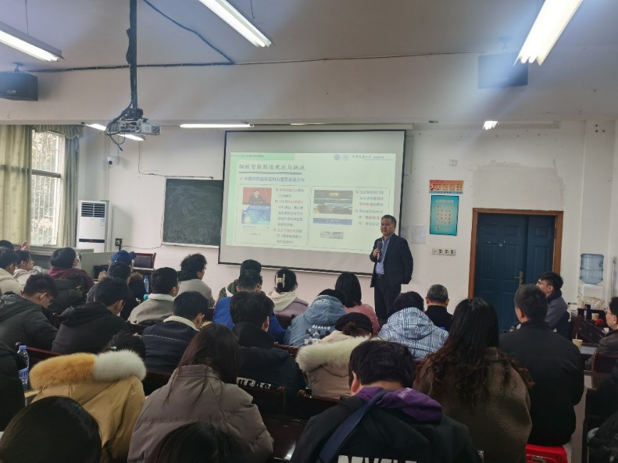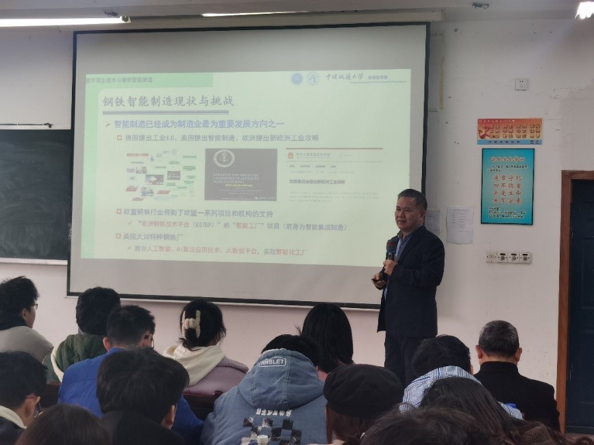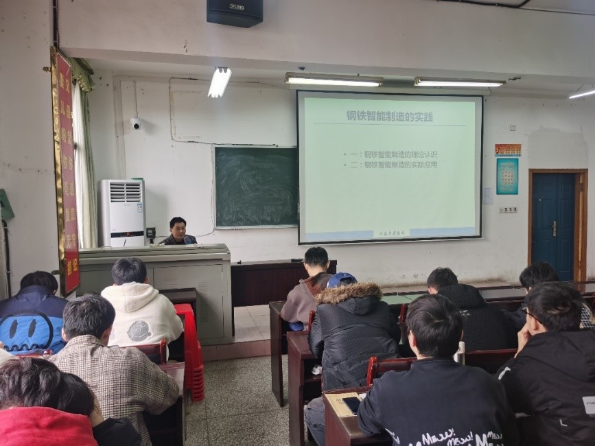 冯力力主任作了题为《钢铁智能制造的实践》的讲座报告。他从钢铁智能制造的理论认识、钢铁智能制造的实际应用两个方面进行详细介绍,围绕涟钢生产智能制造技术方面热情地与同学们交流探讨。