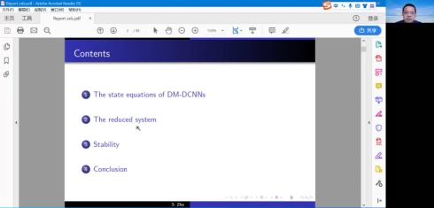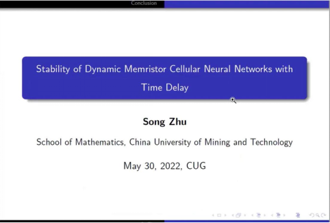 朱松教授是中国矿业大学数学学院资深教授,主要研究方向是随机系统稳定性理论、神经网络、忆阻器、流体网络。本次报告会朱教授介绍了基于忆阻的细胞神经网络模型,以及该神经网络的单稳定性和多稳定性及其联想记忆应用。朱教授用严谨并富有热情的报告给贝博官网研究生介绍了具有时滞的动态忆阻细胞神经网络的稳定性研究进展,使学生们对忆阻细胞神经网络有了新的认识,收获良多。