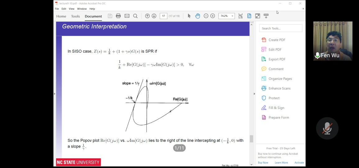 2020年6月,美国北卡罗来纳州立大学吴奋教授为贝博官网研究生讲授《非线性系统分析与控制》课程。该课程由吴奋教授与贝博官网赖旭芝教授共同讲授。课程内吴奋教授分六次为研究生授课12学时,占课程总学时的一半。受到新冠肺炎疫情的影响,采用腾讯会议进行授课。